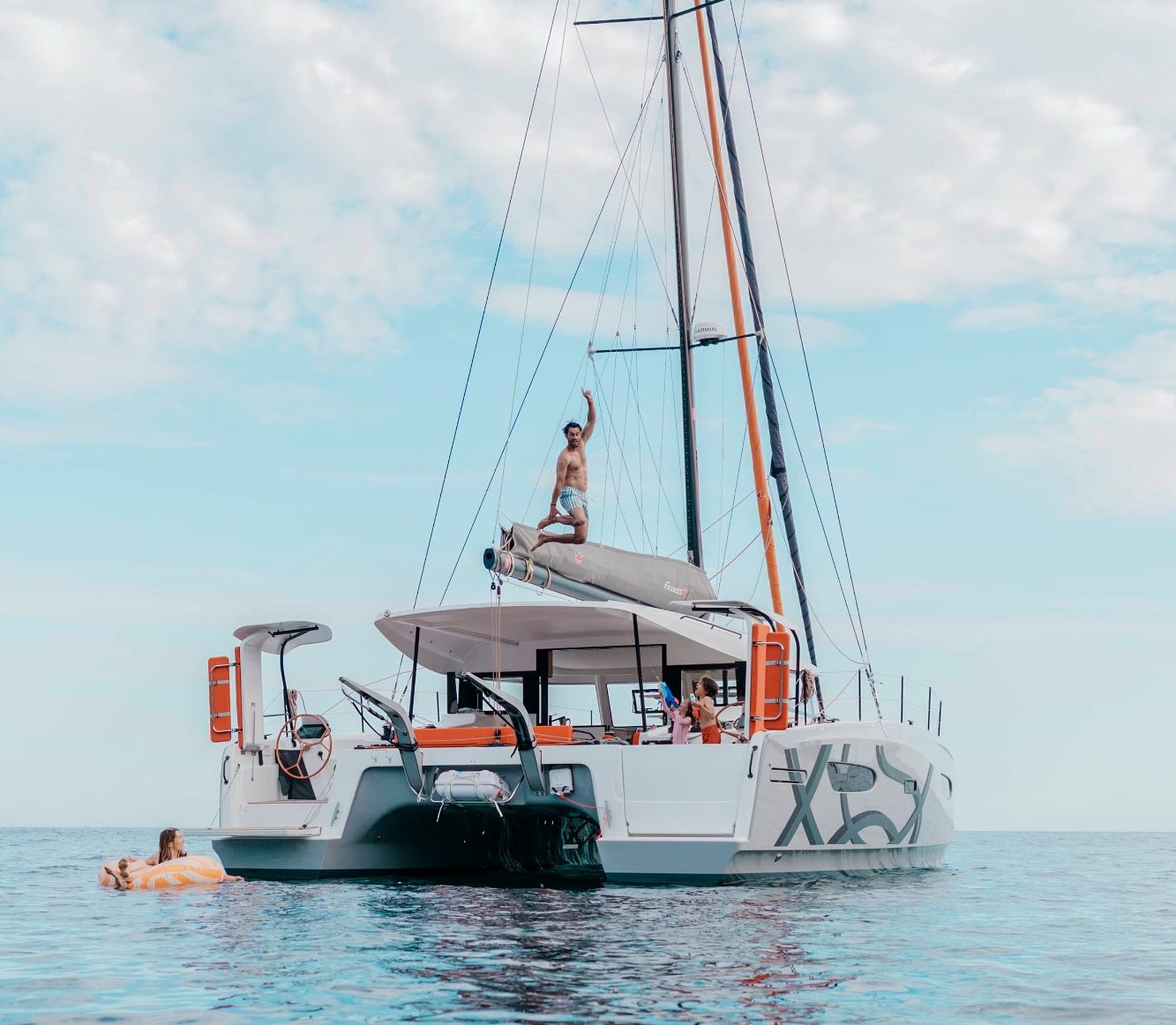 Nous vivons à bord de notre Excess 13, un catamaran à la fois sportif et apaisant, que nous ouvrons à ceux qui souhaitent goûter à une mer plus douce, plus vraie.
